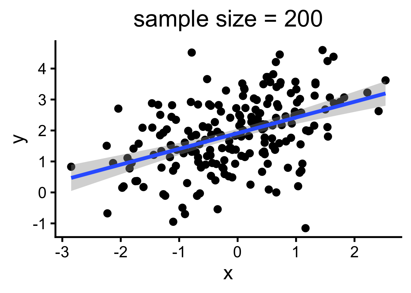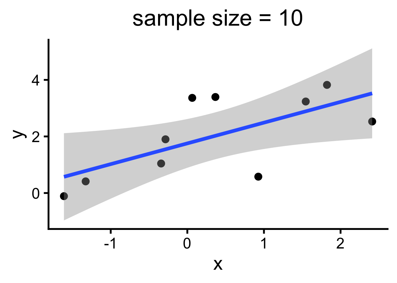 ggplot(data_n10, aes(x = x, y = y)) +geom_point() +labs(title ="sample size = 10") +geom_smooth(method ="lm", formula ="y ~ x")ggplot(data_n200, aes(x = x, y = y)) +geom_point() +labs(title ="sample size = 200") +geom_smooth(method ="lm", formula ="y ~ x") model_n10 <-lm(y ~ x, data = data_n10)summary(model_n10)model_n200 <-lm(y ~ x, data = data_n200)summary(model_n200)