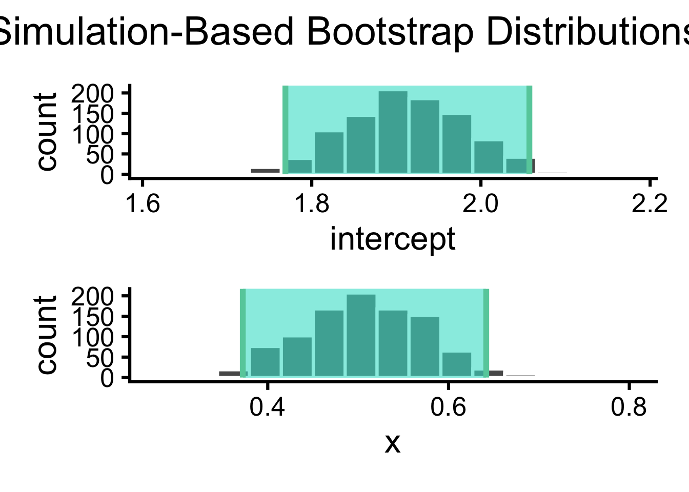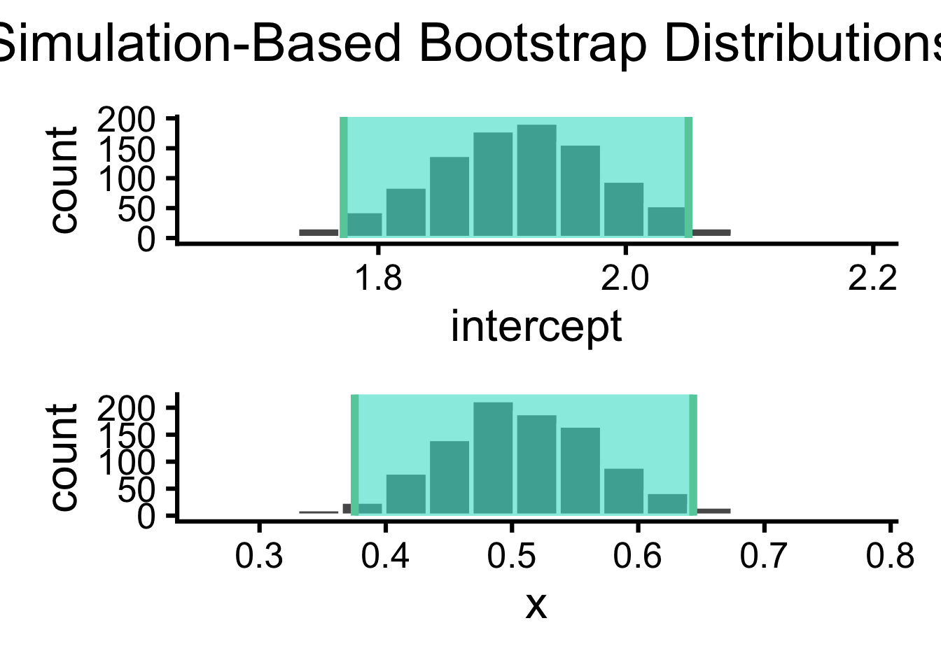# get the observed fit observed_fit <- data_n200 %>%specify(y ~ x) %>%fit() # constructe the sampling distribution boot_fits <- data_n200 %>%specify(y ~ x) %>%generate(reps =1000, type ="bootstrap") %>%fit() # get the confidence interval ci <- boot_fits %>%get_confidence_interval(point_estimate = observed_fit, # from abovelevel =0.95, type ="se" )# visualize the sitribution and ci boot_fits %>%visualize() +shade_ci(endpoints = ci) cisummary(model_n200)