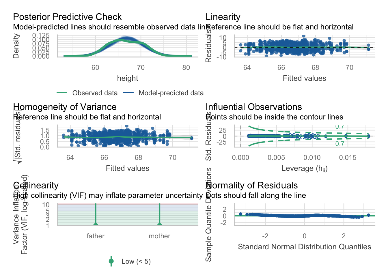 galton_model <-lm(height ~ father + mother, data = Galton)check_model(galton_model)