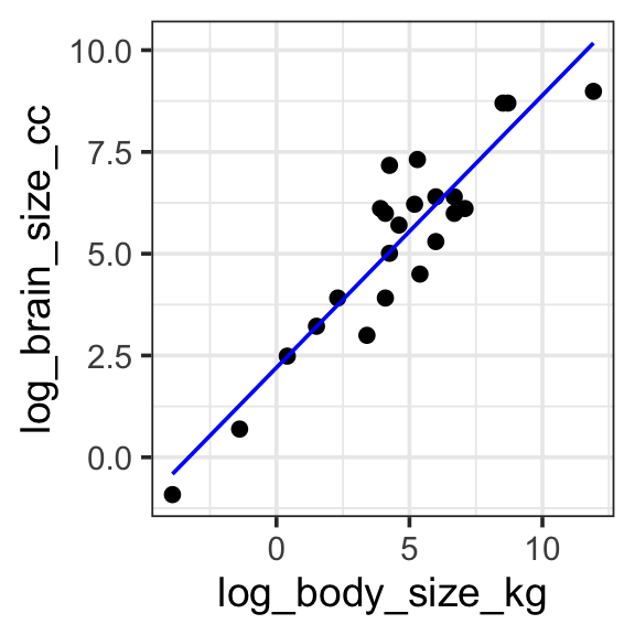 We can apply a log transform directly in the model specification provided to R. This works great, but if we try to plot the fitted model on untransformed data (e.g. if we use brain_size_cc and body_size_kg as our y and x aesthetics) something doesn’t seem quite right. Instead, we should plot the data transformed to log as well, so the model predictions match the data.