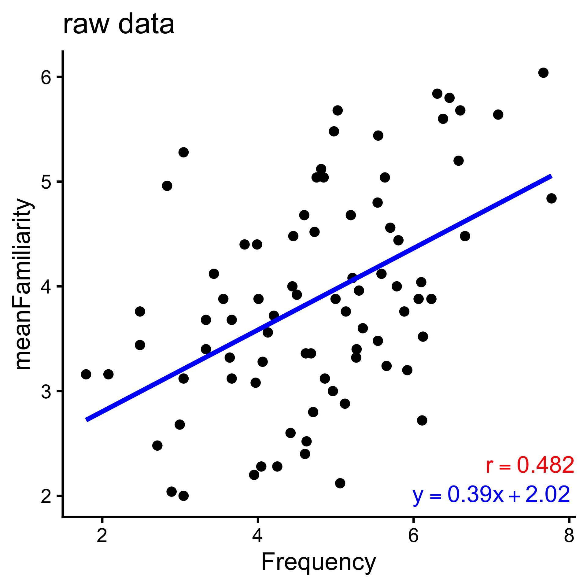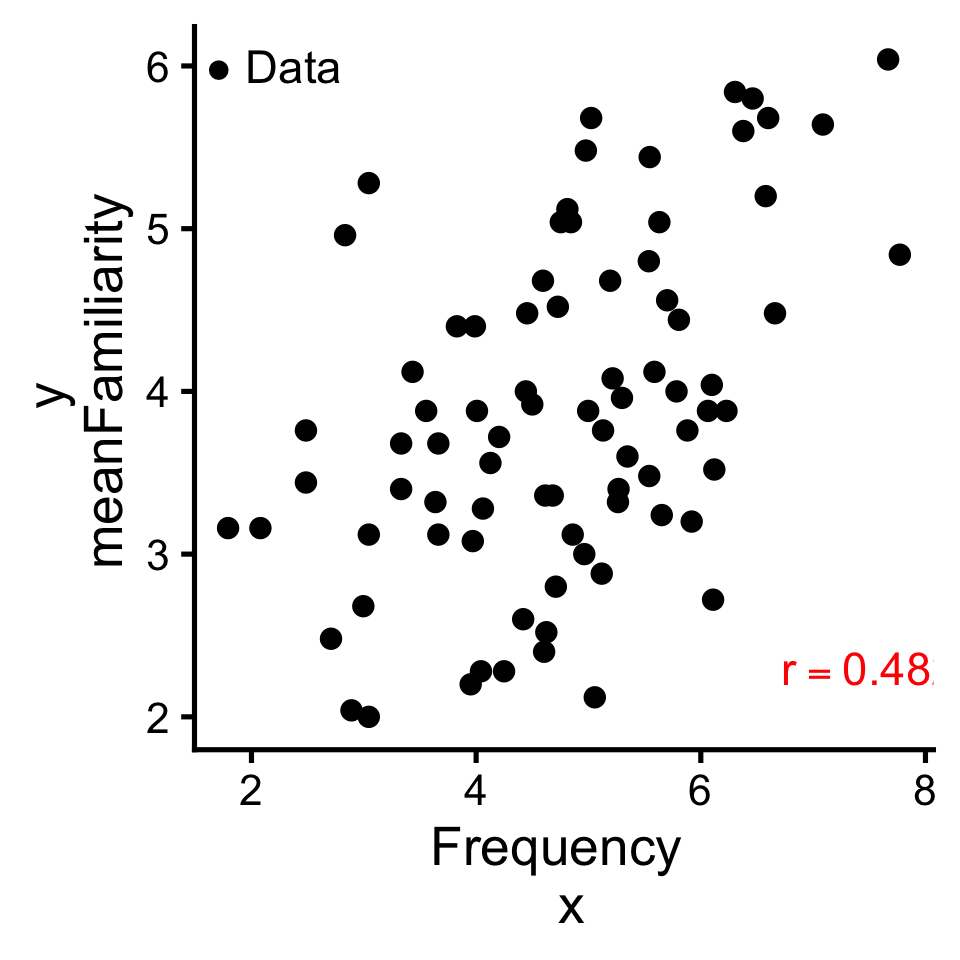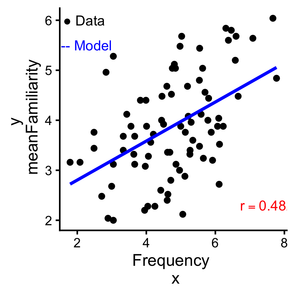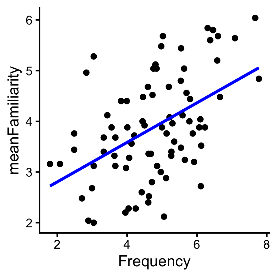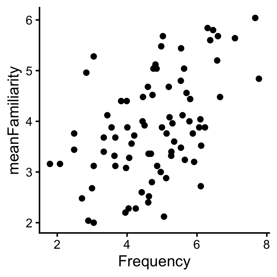 To review what we learned before break, let’s explore the relationship between Frequency and meanFamiliarity in the ratings dataset of the languageR package.
