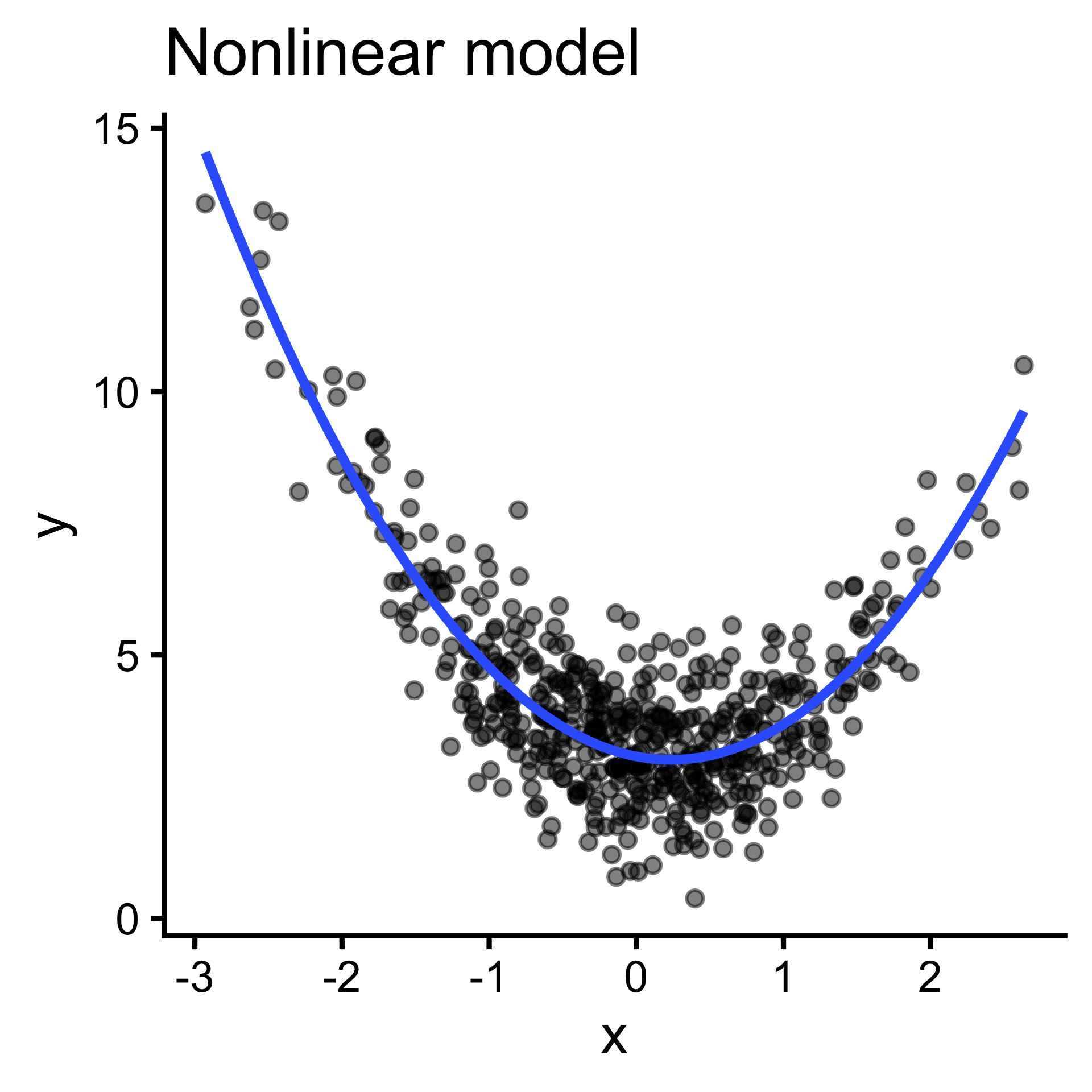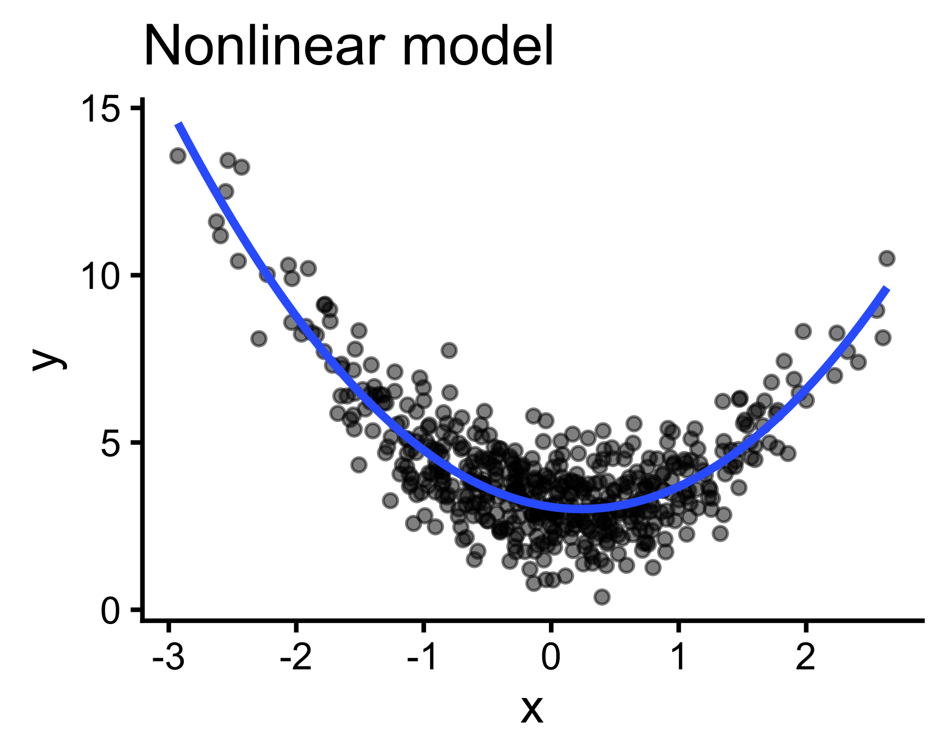 Output (y) cannot be expressed as a weighted sum of inputs(\(y=\sum_{i=1}^{n}w_ix_i\) ); pattern is better captured by more complex functions. (But often we can linearize them!)