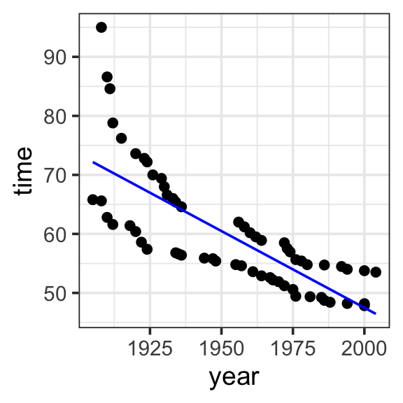y ~ 1, in eq: \(y=w_1x_1\)y ~ 1 + year, in eq: \(y = w_1x_1 + w_2x_2\)