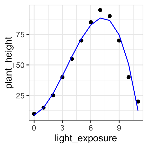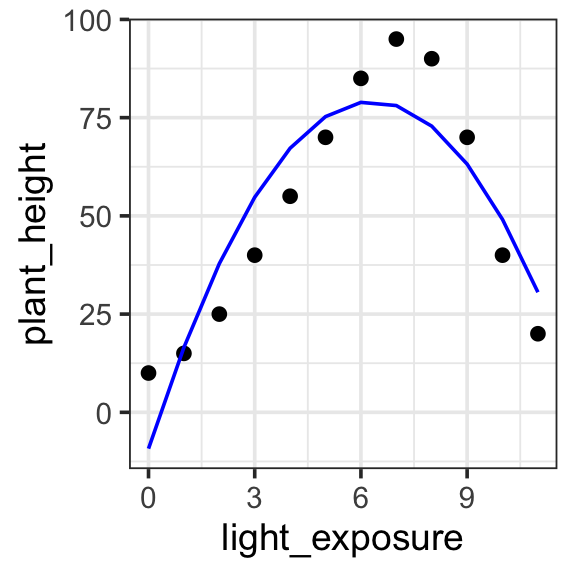 model <- lm(plant_height ~ 1 + light_exposure + I(light_exposure^2), data = poly_plants)