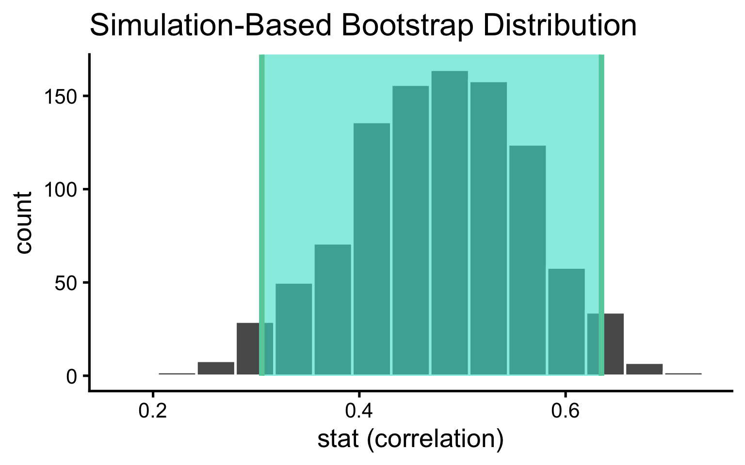Use the infer way to visualize the sampling distribution and shade the confidence interval we just computed. Change the x-axis label to stat (correlation) as pictured below.