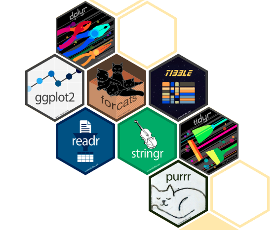 ggplot2 - for data visualizationdplyr - for data wranglingreadr - for reading datatibble - for modern data framesstringr: for string manipulationforcats: for dealing with factorstidyr: for data tidyingpurrr: for functional programming