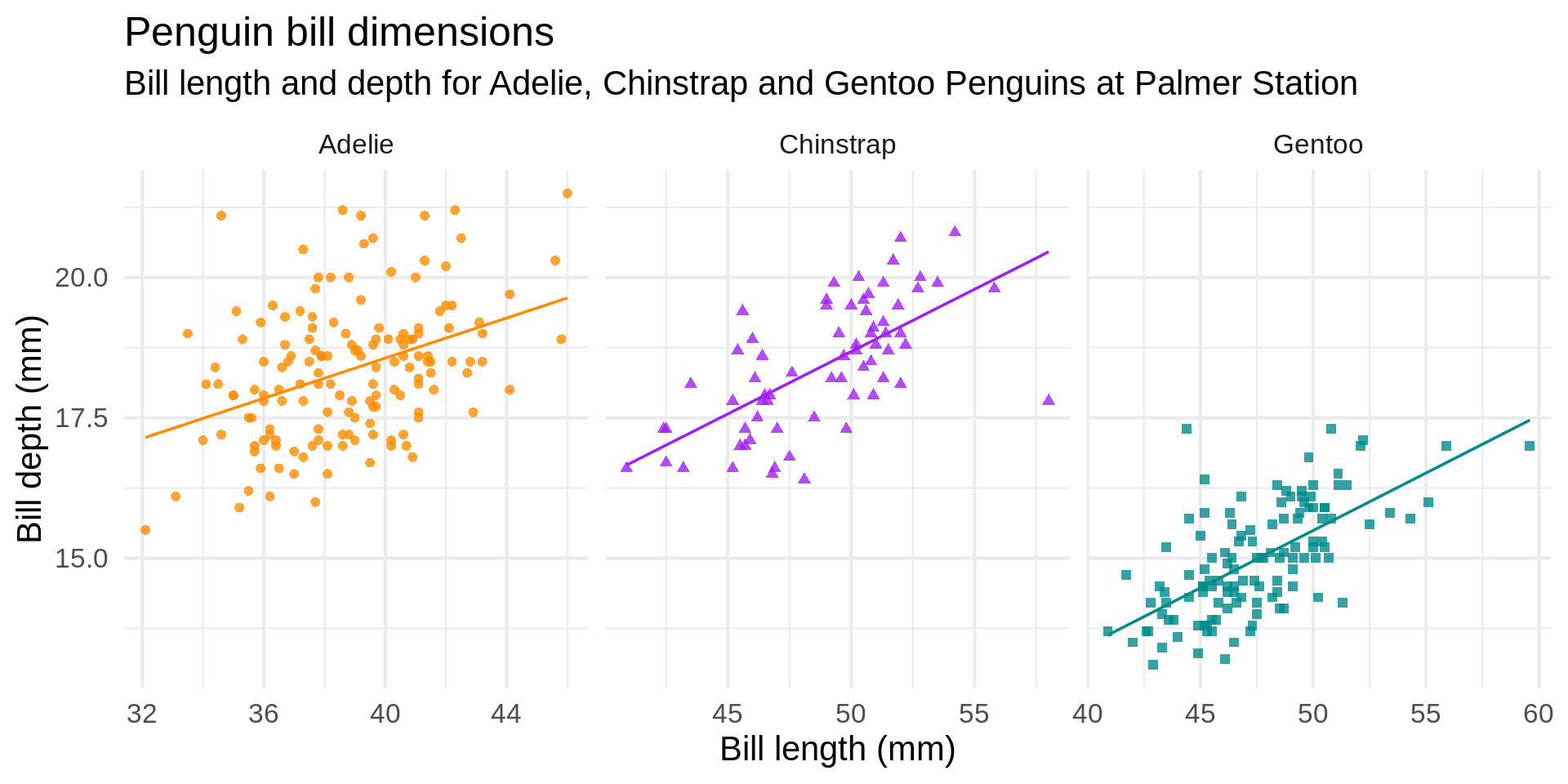 geom_point() with geom_smooth(method="lm")We can also map to color, by specifying globally