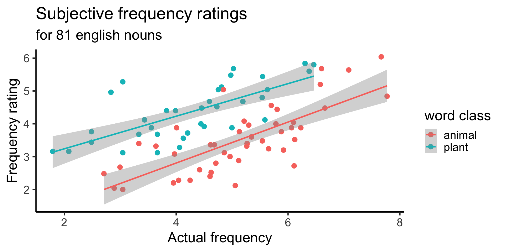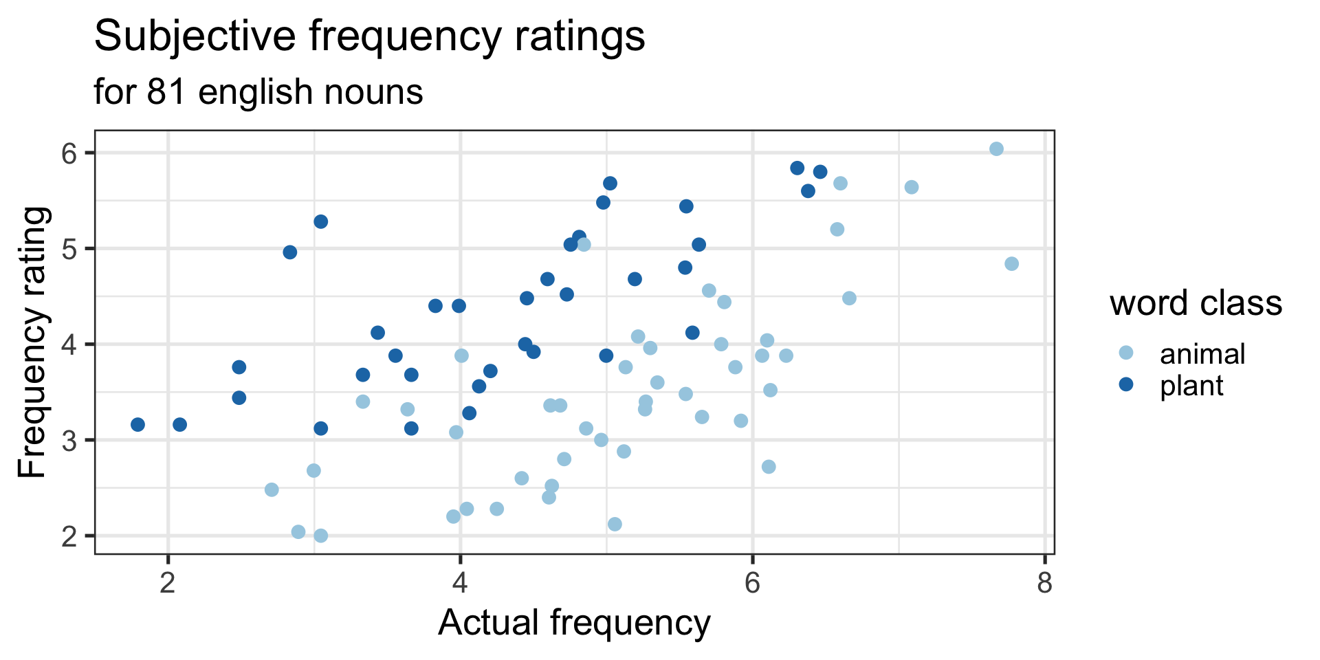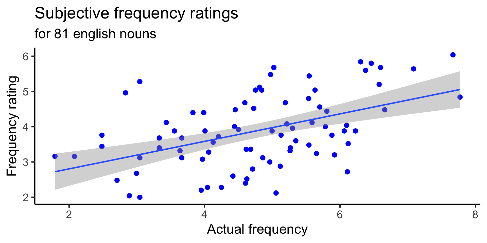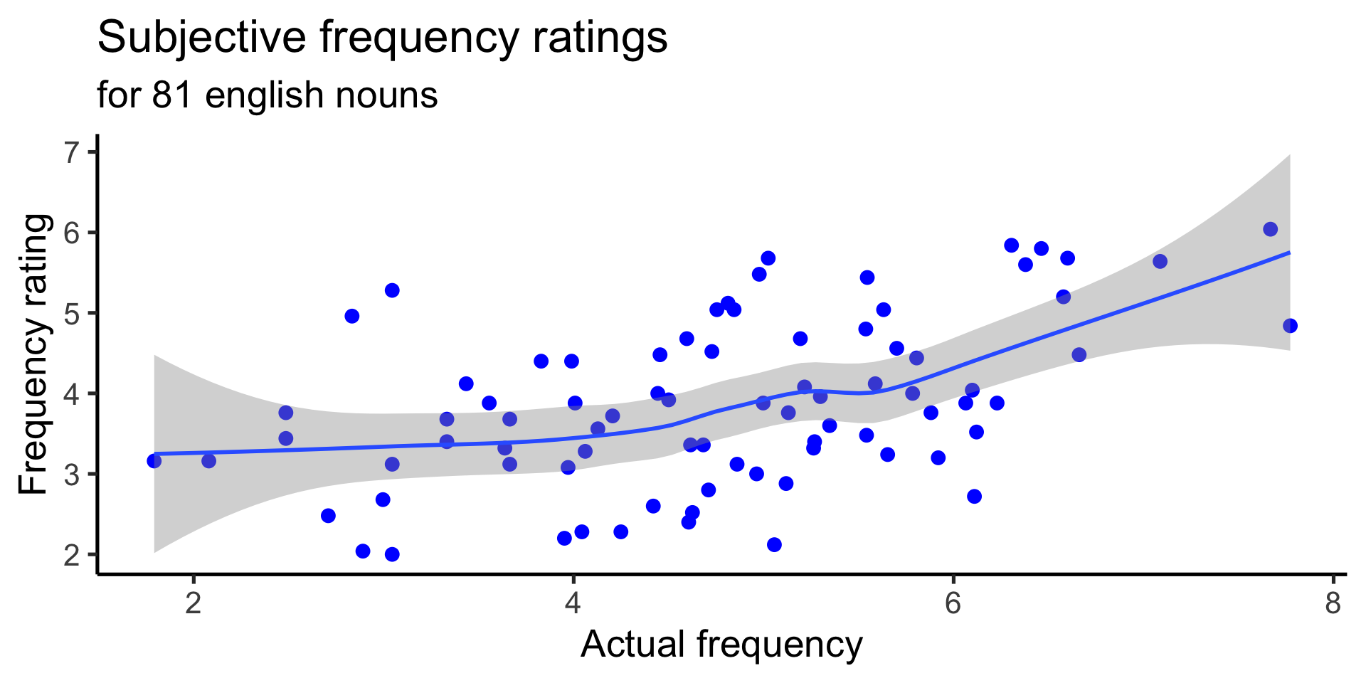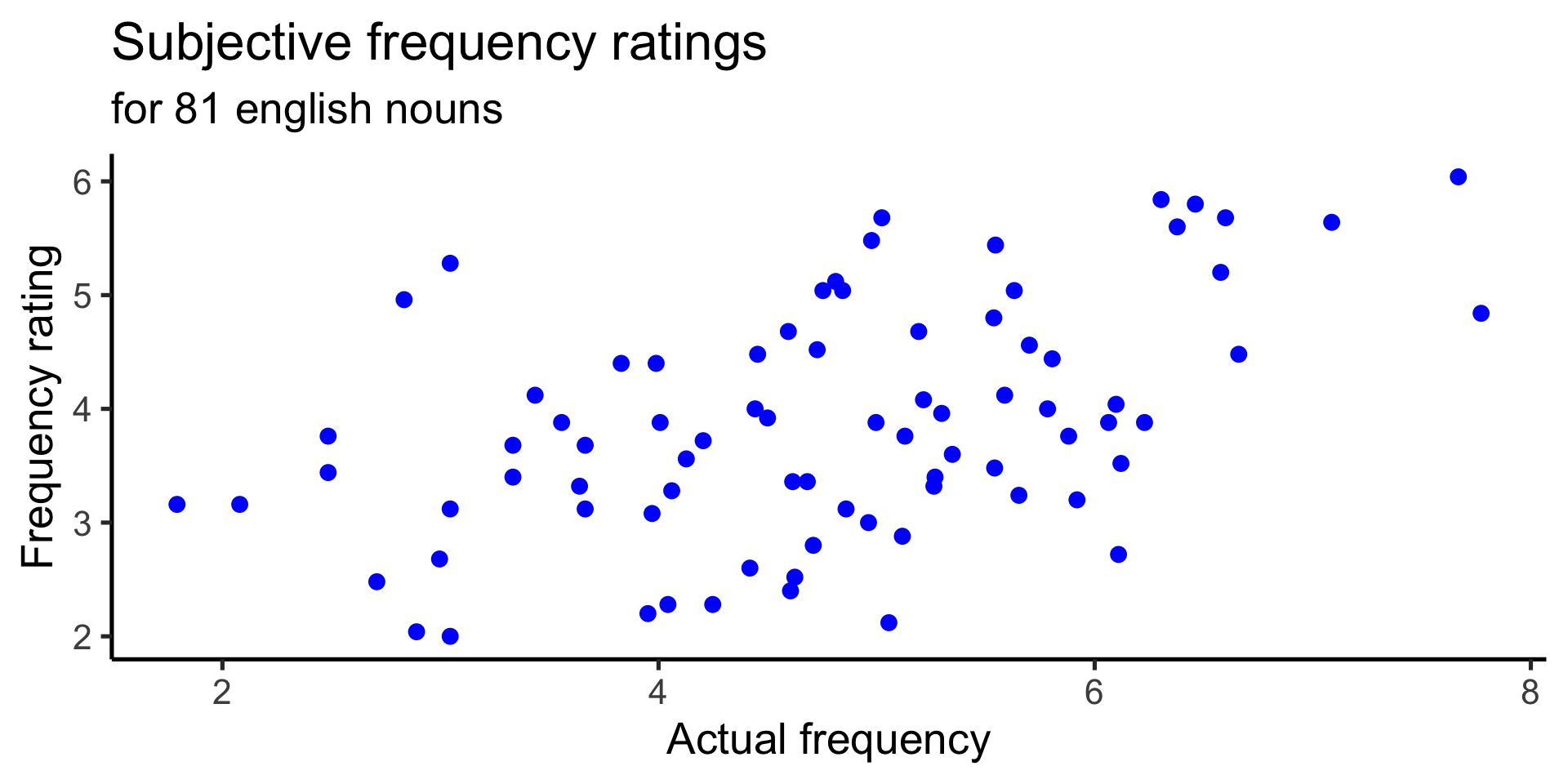 ratingsSubjective frequency ratings, ratings of estimated weight, and ratings of estimated size, averaged over subjects, for 81 concrete English nouns. – languageR