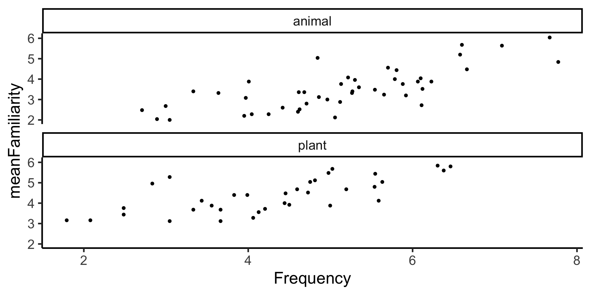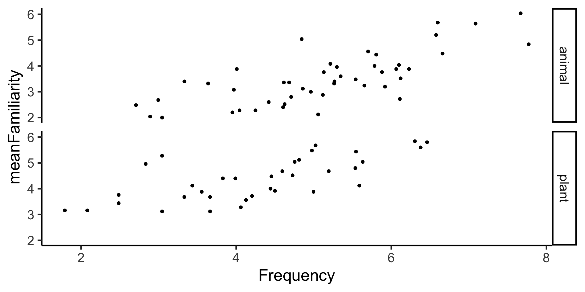 Frequency - actual word frequencymeanFamiliarity - subjective frequency ratingClass - whether word is a plant or animal Word Frequency Class