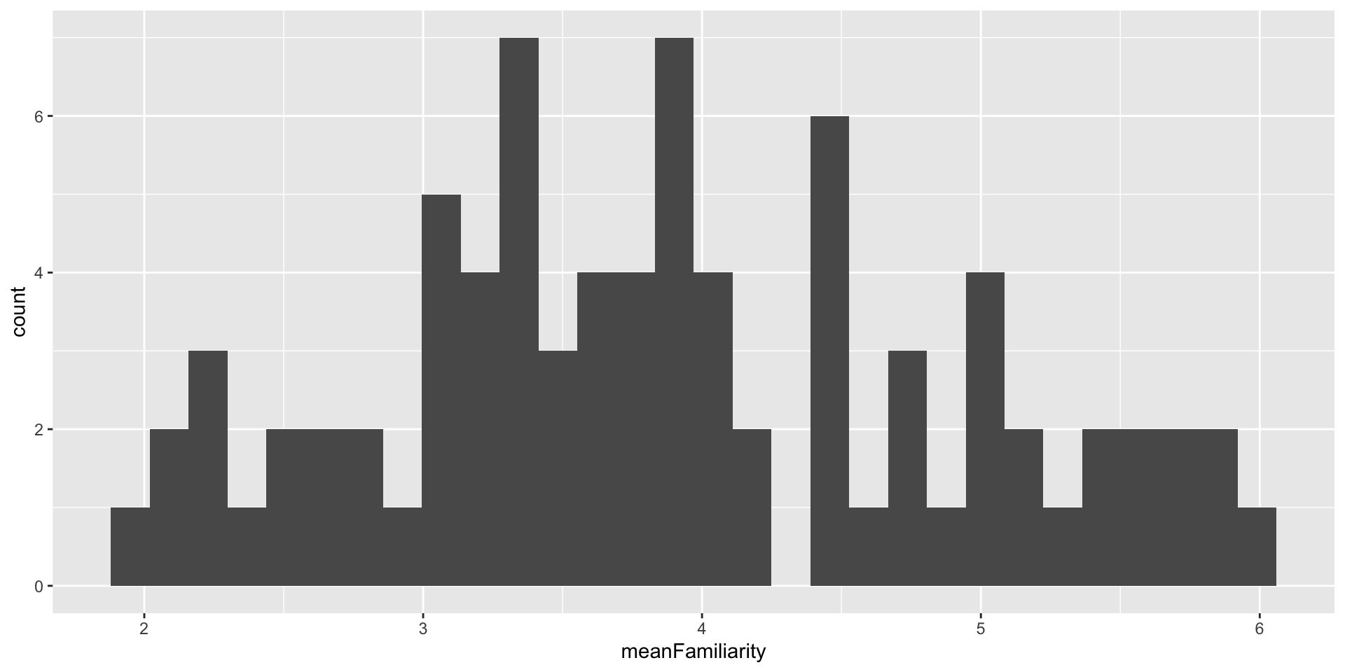 $ meanFamiliarity : num 3.72 3.6 5.84 4.4 3.68 4.12 2.12 5.68 3.2 2.2 ...