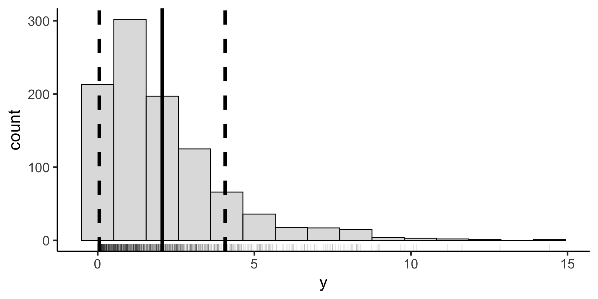 We can calculate any arbitrary coverage interval. In the sciences we often use the 95% coverage interval — the difference between the 2.5 percentile and the 97.5 percentile — including all but 5% of the data.