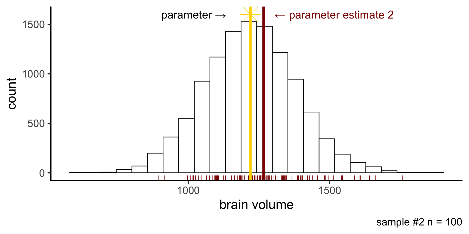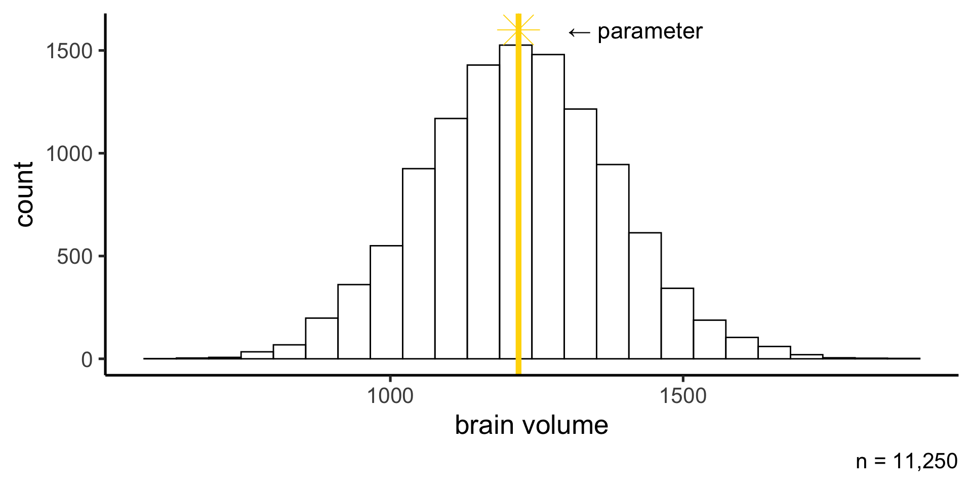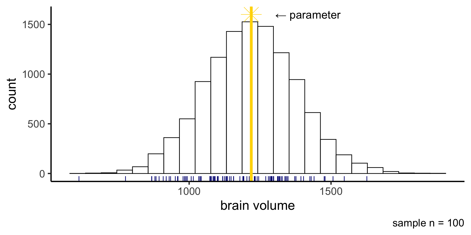 When measuring some quantity, we are usually interested in knowning something about the population: the mean brain volume of Penn undergrads (the parameter)